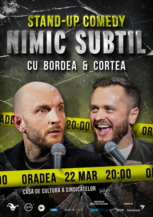 Cătălin Bordea și Nelu Cortea aleg calea directă în noul lor show de stand-up comedy - “Nimic subtil”. Și este exact ceea ce ai nevoie! Într-o lume care ne cere constant să fim cu perdea și să ne ascundem trăirile în spatele unui zâmbet politicos, Bordea și Cortea spun lucrurilor pe nume. Filtru? Nu există. Subtilitate? Zero. Glume? Din plin.