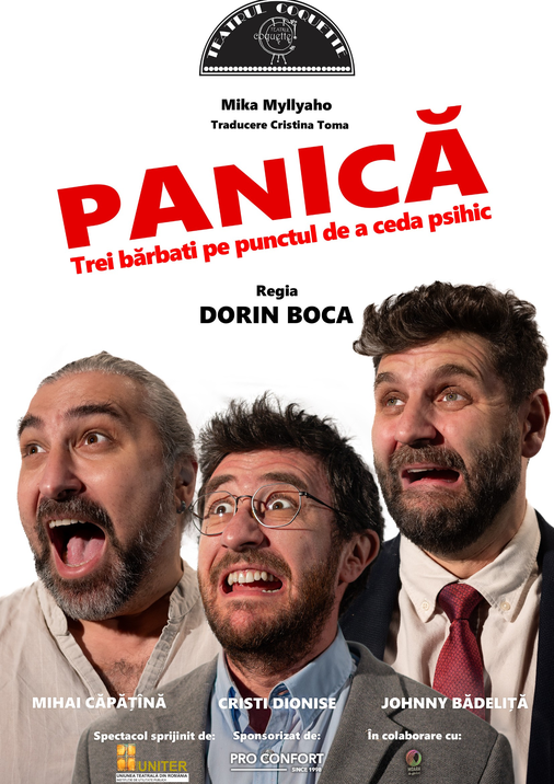 Spectacolul „Panică” explorează crizele de identitate și zbuciumul interior al bărbaților moderni. Max, Joni și Leo, trei prieteni din copilărie, se confruntă cu propriile provocări personale și profesionale. Mai multe detalii