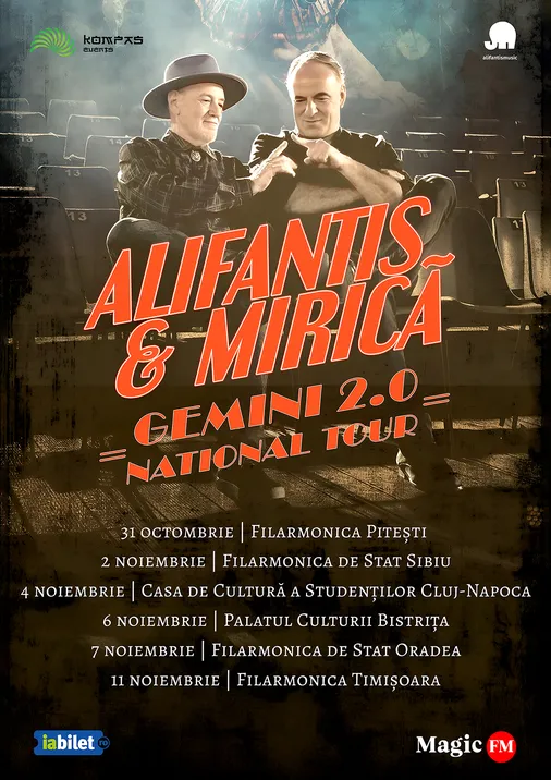 Pe 31 octombrie 2026, de la ora 20:00, Nicu Alifantis și Răzvan Mirică aduc la Pitești spectacolul „GEMINI 2.0”, parte din turneul național care celebrează dialogul artistic, prietenia scenică, zodia și muzica spusă cu sinceritate. Evenimentul va avea loc la Filarmonica Pitești, într-o seară dedicată emoției și rafinamentului muzical. Mai multe detalii