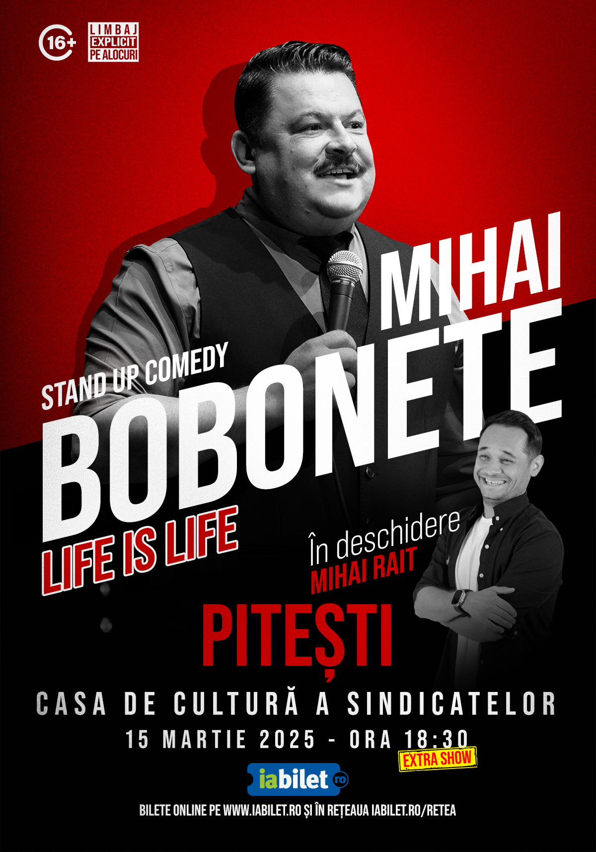 În noul spectacol de stand-up comedy, "Life is Life", Mihai Bobonete aduce pe scenă o serie de întâmplări amuzante și pline de viață, inspirate din experiențele cotidiene. Cu umorul său autentic și stilul caracteristic, Bobonete reușește să transforme situațiile obișnuite în momente de râs pe cinste. Ca și anul trecut, spectacolul va fi deschis de prietenul și colegul său de scenă, Mihai Rait, pregătind terenul pentru o seară plină de bună dispoziție.