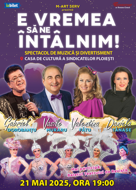 „E vremea să ne întâlnim!” – o seară de neuitat vă așteaptă la Casa de Cultură a Sindicatelor din Ploiești, pe 21 mai 2025!Iubitorii de teatru de revistă, comedie și muzică de suflet sunt invitați să se bucure de un spectacol de excepție, unde buna dispoziție și nostalgia se împletesc armonios.