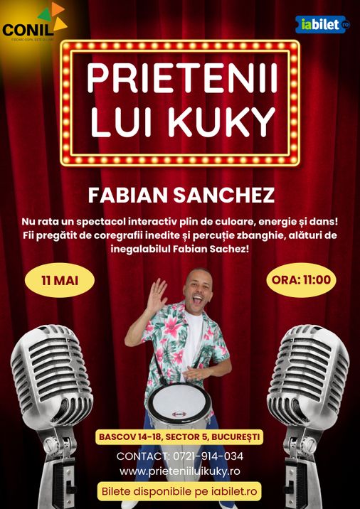 Fabian Sanchez vă invită cu mic, cu mare, la un super spectacol interactiv de dans și percuție. Ne vom distra alături de Fabian pe ritmuri latino, încărcându-ne de energie, voie-bună și veselie.