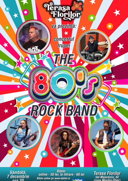 Cu bucurie vă invităm la un super-concert al trupei “THE 80’S ROCK BAND”, unde, într-o atmosferă de party, ne vom reaminti, vom fredona și chiar vom dansa pe cunoscute hit-uri pop-rock ale anilor ’80 preluate de la Simple Minds, Bryan Adams, Billy Idol, The Police, Dr. Feelgood, Tears for Fears și multe altele. Mai multe detalii