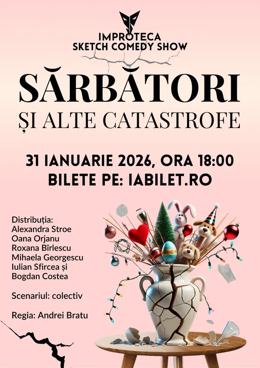 Vă invităm pe 31 ianuarie 2026, ora 18:00, la spectacolul Sărbători și alte catastrofe un sketch comedy care transformă momentele „magice” ale sărbătorilor într-un carusel de aventuri pline de umor.