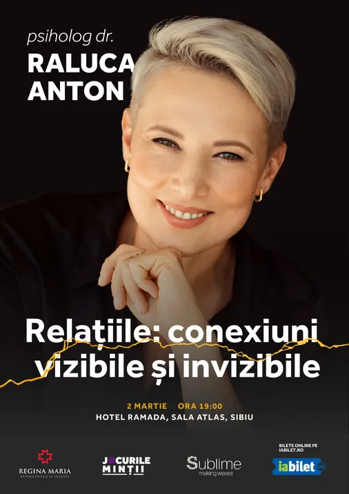 Psih. Dr. Raluca Anton te invită la o seară sub tema „Relațiile: conexiuni vizibile și invizibile”, o întalnire despre felul în care legăturile dintre oameni ne modelează pe fiecare dintre noi. Mai multe detalii