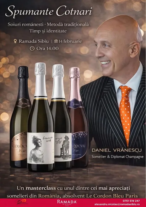 Te invităm la un masterclass dedicat spumantelor românești obținute prin metoda tradițională, susținut de Daniel Vrănescu, în cadrul festivalului de vinuri Sibiu Wine Festival editia a II-a de la Ramada Sibiu.
