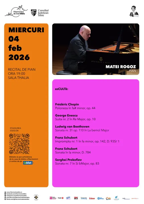Matei Șerban Rogoz revine pe scena Sala Thalia pentru un recital de pian construit în jurul marilor repere ale repertoriului clasic și romantic. Pianist cu o solidă formare academică, absolvent al Universității Naționale de Muzică din București și doctor în muzică, Matei Rogoz a susținut recitaluri pe scene din România, Europa, Statele Unite și Asia. Activitatea sa îmbină interpretarea concertistică, cercetarea muzicologică și promovarea creației românești, în special a operei lui George Enescu. Mai multe detalii