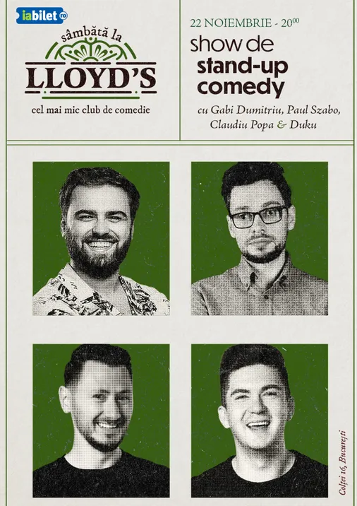 Sâmbătă, 22 noiembrie, ora 20:00, la Lloyd's Comedy Club dăm startul distracției de weekend alături de 5 comedianți care ne vor binedispune cu un Show de Stand-up Comedy plin de umor și energie