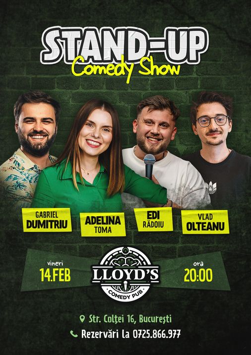 Vineri, 14 februarie, ora 20:00, la Lloyd's Comedy Pub dăm startul distracției de weekend alături de 4 comedianți talentați care ne vor binedispune cu un Show de Stand-up Comedy plin de umor și energie