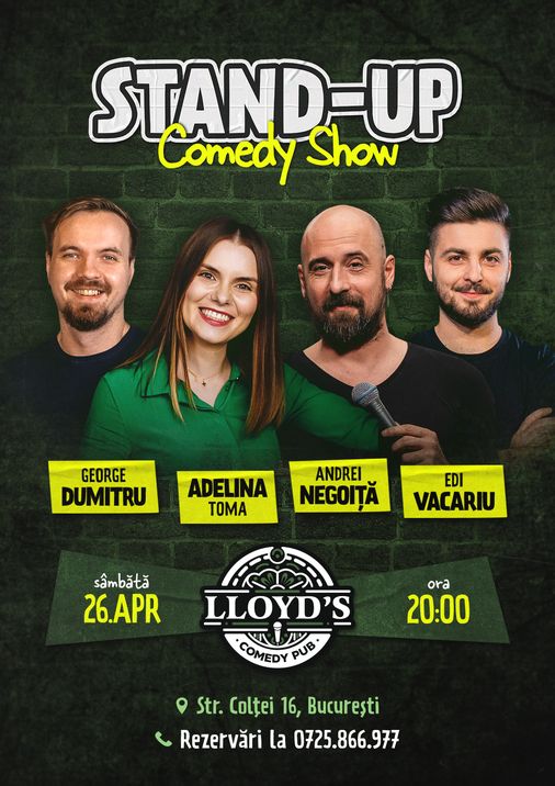 Sâmbătă, 26 aprilie, ora 20:00, la Lloyd's Comedy Pub dăm startul distracției de weekend alături de 4 comedianți talentați care ne vor binedispune cu un Show de Stand-up Comedy plin de umor și energie.