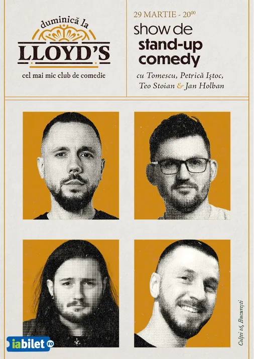 Te așteptăm la Lloyd's Comedy Club să te distrezi alături de noi la un Show de Stand-up Comedy oferit de 4 comedianți talentați, pregătiți să te facă să râzi cu momentele lor pline de umor.