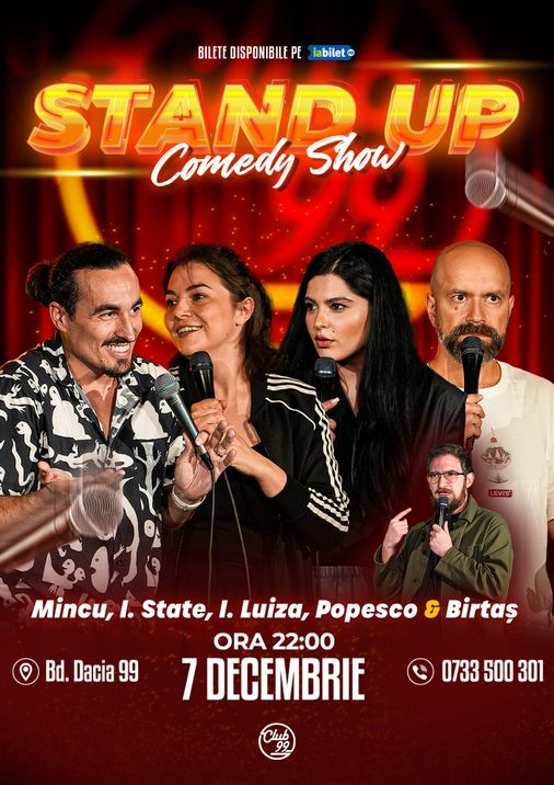Vă așteptăm la o seară de stand-up comedy alături de Mincu, Ioana Luiza, Ioana State, Cristi Popesco si Birtaș!
