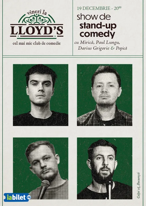 Te așteptăm la Lloyd's Comedy Club să te distrezi alături de noi la un Show de Stand-up Comedy oferit de 4 comedianți talentați, pregătiți să te facă să râzi cu momentele lor pline de umor.