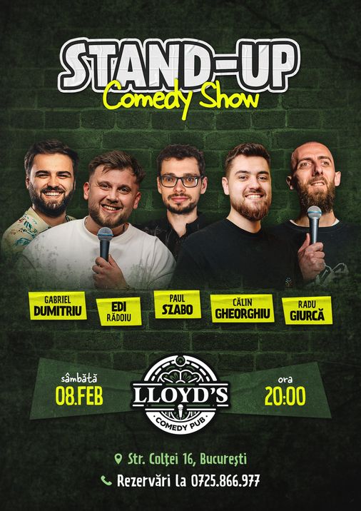 Sâmbătă, 8 februarie, ora 20:00, la Lloyd's Comedy Pub dăm startul distracției de weekend alături de 5 comedianți talentați care ne vor binedispune cu un Show de Stand-up Comedy plin de umor și energie Mai multe detalii