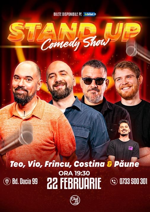Vă așteptăm la o seară de stand-up comedy alături de Teo, Vio, Frîncu, Costina - Florentin Păune