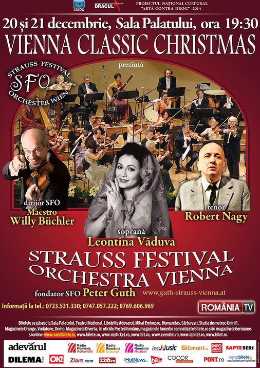 Traieste un Craciun de poveste cu Strauss Festival Orchestra Vienna, maestrul Willy Büchler, soprana Leontina Vaduva si tenorul Robert Nagy. Sambata, 20 decembrie si duminica, 21 decembrie, ora 19.30, la Sala Palatului.