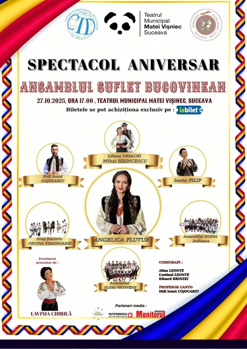 Ansamblul Suflet Bucovinean, aflat sub egida Consiliului Internațional al Dansului – UNESCO, va sărbători primul an de la înființare printr-un spectacol aniversar ce va avea loc luni, 27 octombrie 2025, începând cu ora 17:00, la Teatrul Municipal Matei Visinesc.