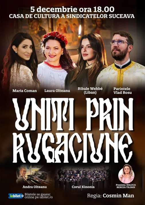 În data de 5 decembrie 2024, Casa de Cultură a Sindicatelor din Suceava va găzdui un eveniment cultural deosebit intitulat "UNITI PRIN RUGĂCIUNE". Acest spectacol unic va reuni artiști renumiți din diverse domenii muzicale, într-o seară dedicată spiritualității, tradiției și unității. Mai multe detalii