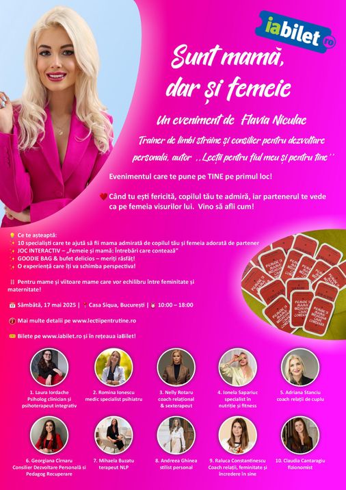 „Sunt mamă, dar și femeie” nu este un eveniment despre creșterea copiilor, ci despre cum să fii o mamă fericită și împlinită, dar și o parteneră atrăgătoare și plină de viață. Vino să înveți cum să îți regăsești echilibrul între maternitate și feminitate, cum să îți capeti energia și cum să trăiești o viață autentică și plină de împliniri!