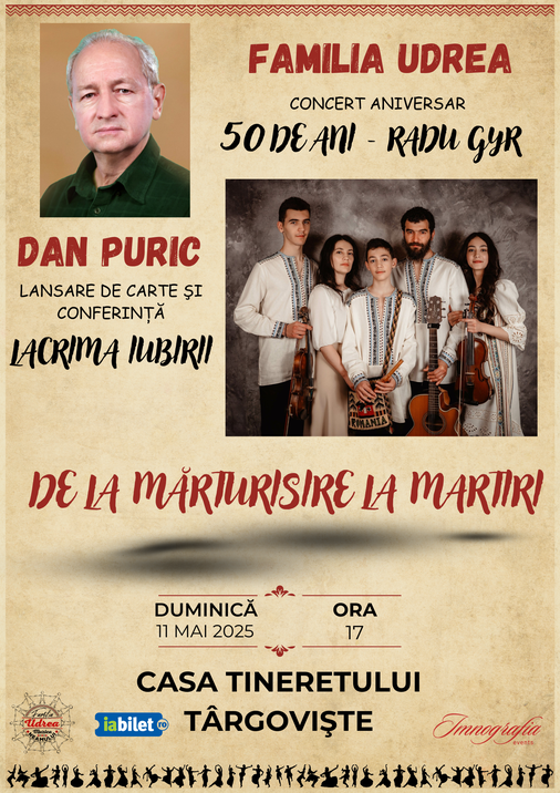 Martirii sunt cei care mărturisesc adevărul pentru că ei au fost mânați în viață de un singur dor: dragostea de Dumnezeu. Maestrul Dan Puric şi Familia Udrea vă invită la o întâlnire lângă aceşti mărturisitori care au adăpat cu poeziile şi cântecele lor izvorâte din lacrimile iubirii întreaga suflare românească.