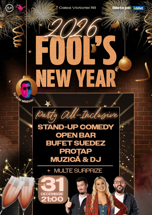 Îți dăm noi revelion în centru, fix pe Calea Victoriei, la numărul 118, adică acolo unde sunt oamenii ăia mișto cu glumele la ei, Open Bar cu de toate, DJ cu talent la butoane, bufet suedez, dar și mâncare tradițională preparată live, adică mare proțap. Dacă nu e ăsta un revelion fool-inclusive, deci CU DE TOATE, atunci nu știm care ar putea fi. Și încă nu ți-am zis cea mai bună parte: tu nu trebuie să te ocupi de nimic. Nu tu mergi la cumpărături, nu tu faci platouașe, nu tu prepari băuturi pentru oameni. Nu! Tu trebuie doar să vii la The Fool.