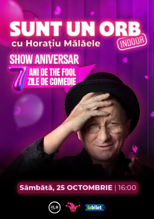 Horatiu Malaele aduce, la The Fool, un show pentru sufletul tuturor: „Sunt un orb”. Un artist desăvârșit, maestrul își provoacă publicul cu un umor autentic și oferă un recital-capodoperă, având ca principale caracteristici emoția, ironia și comedia. Și să îți spunem un secret: pentru ca glumele să te lovească bine avem nevoie ca tu să ajungi la show-uri la timp. Cu alte cuvinte, pentru glume punctuale, e nevoie de un public punctual. Acestea fiind zise, am vrea să știi că accesul se face cu 30 de minute înainte de show. Ne bazăm pe tine, da?