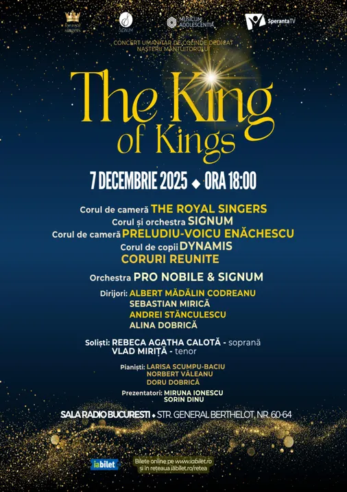 Corul de cameră “The Royal Singers” alături de Corul și orchestra „Signum” te invită la a III-a ediție a Concertului Umanitar de colinde intitulat “THE KING OF KINGS”. Evenimentele anterioare ne-au oferit un feedback atât de important din partea voastră și suntem entuziasmați să organizăm cu ajutorul lui Dumnezeu un nou eveniment. Va fi o nouă seară extraordinară, timp în care te vei putea delecta cu piesele preferate, atât de mult așteptate la sfârșitul fiecărui an. Peste 170 de muzicieni, copii și tineri își vor uni glasurile, instrumentele și vor crea o atmosferă de vis, plină de emoție. Sala Radio se va “îmbrăca” în lumină și culoare, iar cântecele vor reverbera în inimile noastre.