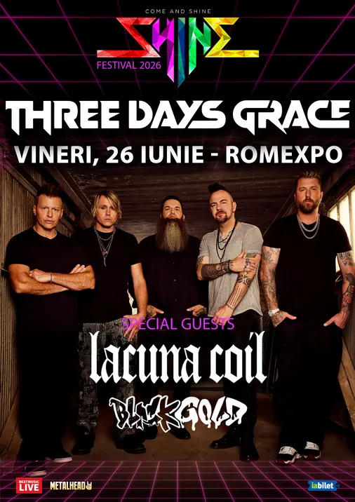 Three Days Grace, Lacuna Coil si Black Gold vor canta la Romexpo pe 26 iunie. Dupa showul Soldout de anul trecut de la Laminor, Three Days Grace revin la Bucuesti tot cu un show de 90 de minute in cadrul Shine Festival, evenimentul de o zi dedicat iubitorilor de rock alternativ. La minim 4 bilete cumparate ai reducere 10%. Nu scapati pachetele de 3X bilete in numar limitat