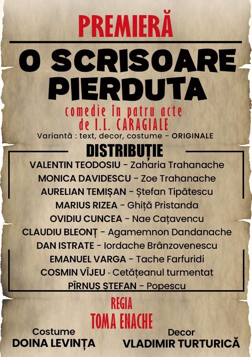 „O scrisoare pierdută” de I.L. Caragiale, piatra de temelie a comediei românești, renaște pe scenă într-o montare care păstrează cu sfințenie spiritul original al capodoperei. Această premieră nu aduce modernizări, reinterpretări sau artificii contemporane: decorurile, costumele și atmosfera sunt redate cu aceeași noblețe și autenticitate care au fascinat generații întregi. Mai multe detalii