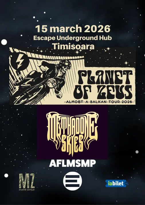 M2 Events presents Planet of Zeus almost Balkan Tour 2026 in Timisoara with coheadliners Methadone Skies and Am Fost La Munte si Mi-a Placut at Escape Underground Hub. Mai multe detalii