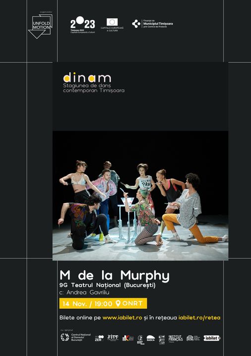 „M de la Murphy” este un puzzle coregrafic bazat pe celebrele legi ale lui Murphy. Andrea Gavriliu și cei opt performeri vorbesc, prin mișcare, despre micile mari paradoxuri din viața noastră, de acele imperfecțiuni care ne unesc și ne îndepărtează în același timp.