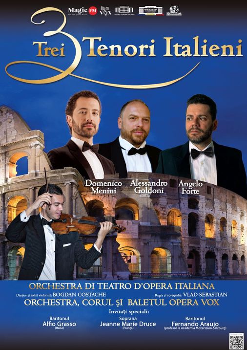 Spectacolul “3 Tenori Italieni” este un omagiu adus marilor tenori José Carreras, Plácido Domingo și Luciano Pavarotti, trei artiști legendari care au cucerit întreaga lume cu vocile și interpretările lor, iar vocile excepționale ale celor 3 tenori invitați, Domenico Menini, Alessandro Goldoni și Angelo Forte, voci în cel mai pur stil al belcanto-ului Italian, vor reaminti publicului de frumoasele voci ale celor care au fondat acest concept.