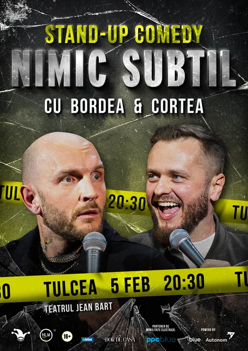 Cătălin Bordea și Nelu Cortea aleg calea directă în noul lor show de stand-up comedy - “Nimic subtil”. Și este exact ceea ce ai nevoie! Într-o lume care ne cere constant să fim cu perdea și să ne ascundem trăirile în spatele unui zâmbet politicos, Bordea și Cortea spun lucrurilor pe nume. Filtru? Nu există. Subtilitate? Zero. Glume? Din plin.