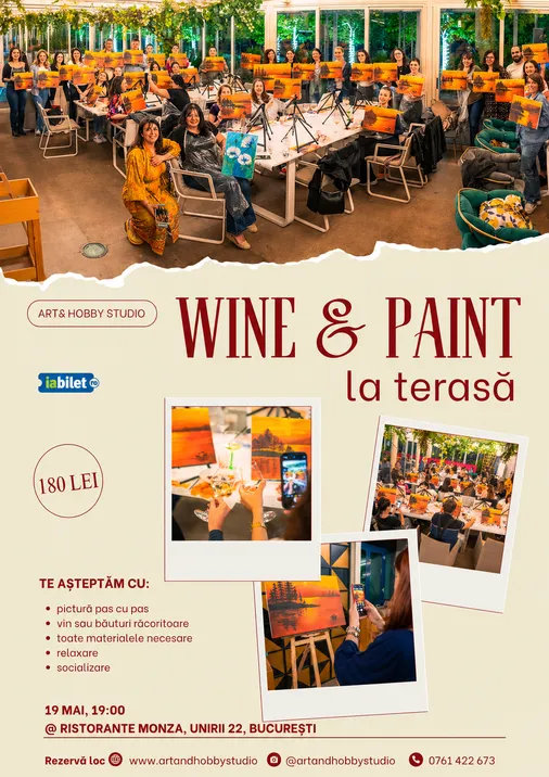 Te invităm să evadezi din rutina zilnică și să te bucuri de o experiență creativă, într-o atmosferă relaxată și prietenoasă. Sub îndrumarea unui artist, vei învăța pas cu pas cum să creezi propriul tău tablou, în timp ce savurezi un pahar de vin bun. Mai multe detalii
