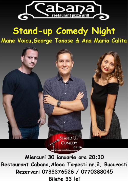 Miercuri 30 ianuarie 2019, de la ora 20:30, va invitam la un super show de Stand Up Comedy cu George Tanase, Mane Voicu & Ana Maria Calita numai la Restaurantul Cabana. Mai multe detalii
