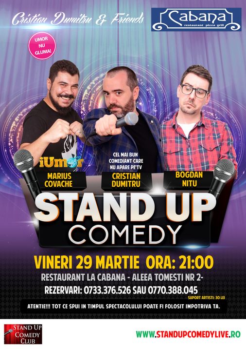 Vineri 29 mar 2019, de la ora 21:00, va invitam la un super show de Stand Up Comedy cu Cristian Dumitru, Marius Covache & Bogdan Nitu la Restaurantul Cabana. Mai multe detalii