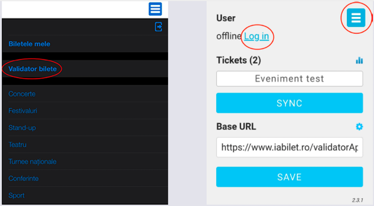 Pentru sincronizarea codurilor, in cazul in care vanzarea ramane activa pe durata evenimentului apasa butonul din coltul dreapta sus, cele 3 liniute paralele, si apoi Sync.