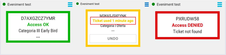 Se apasa butonul Scan, se deschide camera automat si se centreaza codul QR. Validarea biletului se face in cateva secunde vizual si sonor iar pe ecran pot aparea 3 tipuri de mesaje::