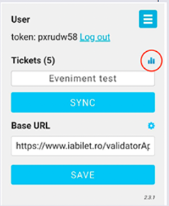Daca doresti sa vezi cate bilete s-au scanat din cate au fost emise de sistem (vandute online cat si cele emise de noi) trebuie sa intri pe butonul din coltul dreapta sus, 3 liniute paralele si iti arata cate bilete s-au scanat din total pe modelul: 5/322, adica 5 bilete scanate din 322 emise.